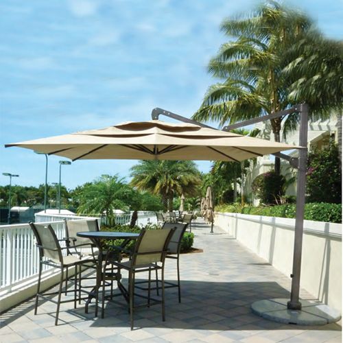 When your commercial or residential outdoor area would function better with an offset umbrella our Cantilever model will provide the coverage you need without the interference of a center pole. These double vented aluminum frame contract grade umbrellas are available in a wide array of fabrics to compliment any decor. Our 360 degree rotating Cantilever umbrella features a smooth-glide trigger lift mechanism and a foot activated rotator to provide 100 square feet of comfortable shade. The steel cross base and granite tiles are included.
