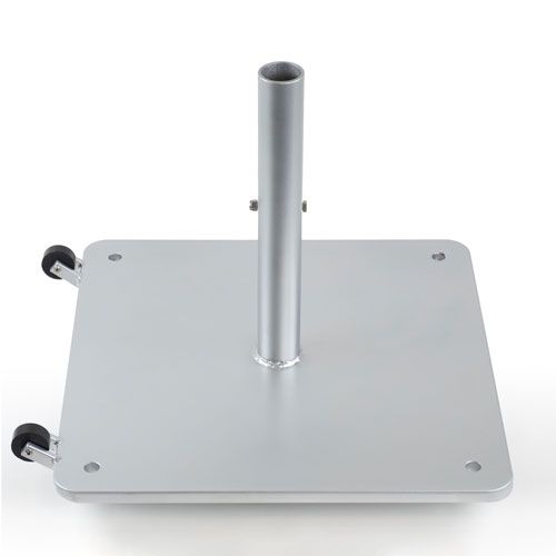 This square umbrella base is made of steel galvanized and powder coated silver or black. It is a low profile steel base with welded base sleeve with through bolt to secure your umbrella up to harsh weather conditions. It also features built in two wheels making it easy to move this heavy base from one spot to another. Please contact for help choosing the perfect base!
