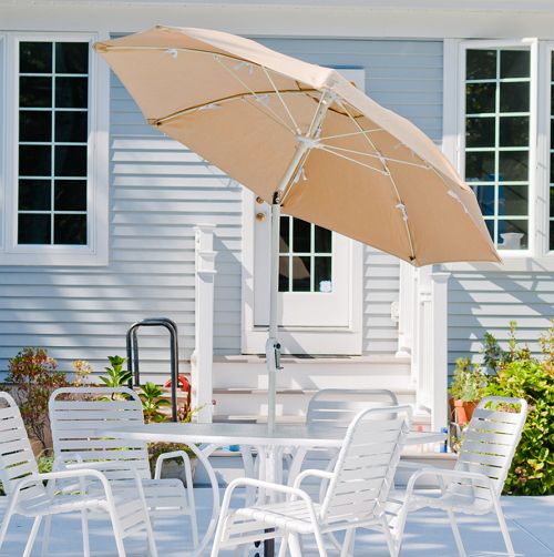 This beautiful umbrella is also fantastically sturdy because of its 8mm solid fiberglass ribs heavy gauge resin parts and spring activated steel ledge. It even offers a large selection of Sunbrella quality fabrics!