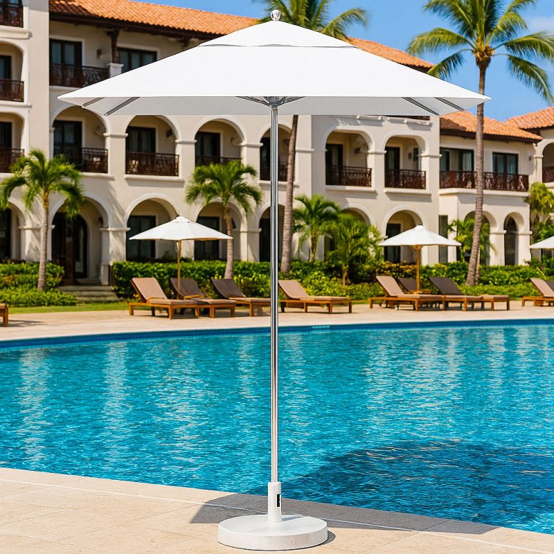 This 7.5' Monterey Premium Commercial Square Market Umbrella is perfect for residential or commercial use. It is one of many high end patio umbrellas that we carry and it has some fabulous features! Among its fabulous features are its eight, 1/2" diameter fiberglass ribs and heavy gauge resin plus stainless steel parts all for the utmost in durability. It also features a 2.3mm thickness aluminum center pole and a heavy fiberglass skeleton. This means that you are getting one of the strongest umbrellas on the market!Â