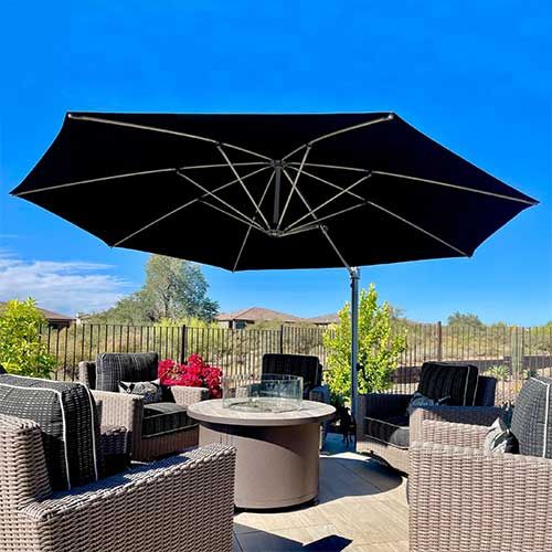 This is an amazing residential umbrella constructed from marine-grade extruded aluminum with .75” (19mm) diameter solid fiberglass ribs. The Aurora cantilever octagon umbrella will last for years and retain its beauty. Features include anodized aluminum frame built for high stability and strength comes standard with all-weather water resistant 9 oz. Marine Grade acrylic fabric. Its full 360 degree rotation ensures you will have shade where you need it all day long. Heavy duty slider car marine grade aluminum struts easy winding handle and easy rotational locking handle make this umbrella easy to operate maintain and will keep looking new year after year.