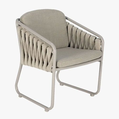 The Cantata Cushioned Dining Chair offers exceptional comfort and style for your outdoor dining space. Its plush seat and back cushions, secured with Velcro ties, provide a secure and relaxing seating experience. Designed with a durable foam weave and available in two sophisticated colors, this chair is built to last. Enhance your patio or garden with this elegant yet functional piece.