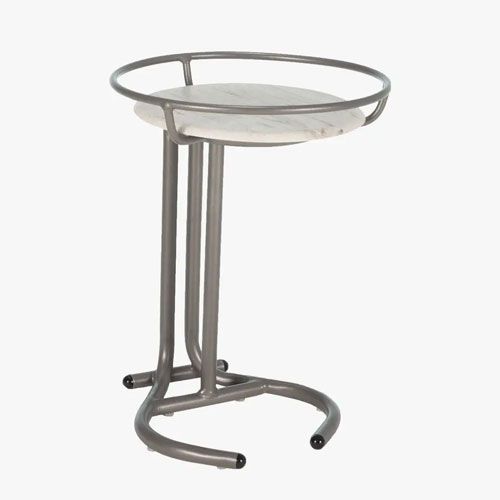 • Tabletops are made from a hybrid engineered stone, combining ground marble and quartz. This variegated, crushed stone composite material is stronger and more durable than natural stone, offering both resilience and a refined aesthetic.