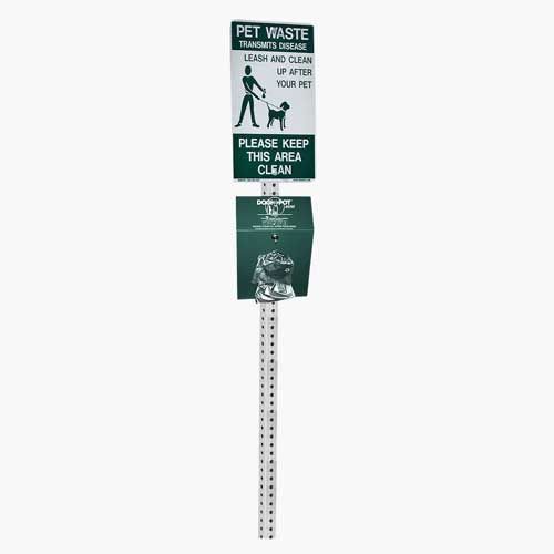 The PBARK-468 Waste Station includes a bag dispenser and waste station signage attached to a steel pole for in-ground mount. The PBARK-468 is only available in Forest Green.