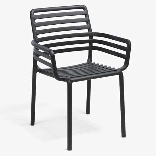 The Euro Form Doga Armchair Stackable is made from fiberglass/polypropylene resins with UV additives incorporated—for superior performance against exposure to sunlight and atmospheric agents. The stackable, streamlined, slatted design creates a comfortable and flexible seating option that complements a wide range of design styles, and the air-molded manufacturing technology ensures a hard-wearing, easy-to-clean product.