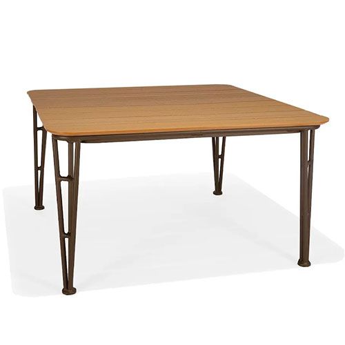 The Fountainhead Square Dining Table is ideal for outdoor cafe or dining areas. This mixed materials table features a 51” slatted table top made of recycled plastic HDPE (High-Density Polyethylene) that adds all the texture and warmth of natural wood, but (unlike wood) it’s low maintenance and impervious to the outdoor elements.