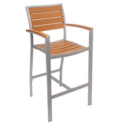 Great option for outdoor dining for restaurants. The Largo Aluminum Commercial Arm Barstool With Synthetic Teak has a powder coated aluminum frame and a faux teak back, armrest and seat for long-lasting durability outdoors. These barstools ship knocked down.