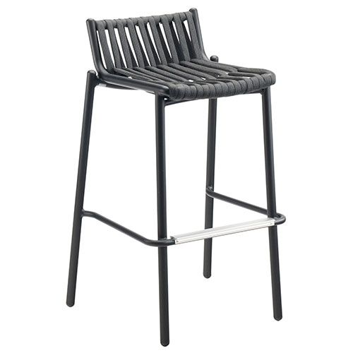 The Loop Aluminum Commercial Patio Barstool features a durable powder-coated aluminum frame with a comfortable soft strap back and seat. This stackable barstool requires no assembly and can be stacked up to four for easy storage.