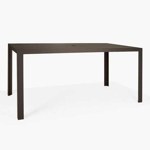 The sleek, transitional design of the Meza 82" x 42" Rectangular Bar Table with umbrella hole, Aluminum Slat makes it a versatile choice for restaurant dining. Made entirely of extruded aluminum, the durable table is available in a range of finishes and accommodates an umbrella.