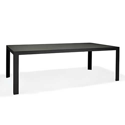 The sleek, transitional design of the Meza 82" x 42" Rectangular Dining Table with umbrella hole, Aluminum Slat makes it a versatile choice for restaurant dining. Made entirely of extruded aluminum, the durable table is available in a range of finishes and accommodates an umbrella.