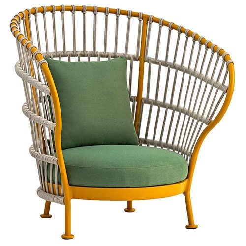 The Nest Aluminum Commercial Patio High Back Lounge Armchair offers a sturdy powder-coated aluminum frame with a stylish rope back. Designed for comfort, it features custom-made cushions and requires no assembly.