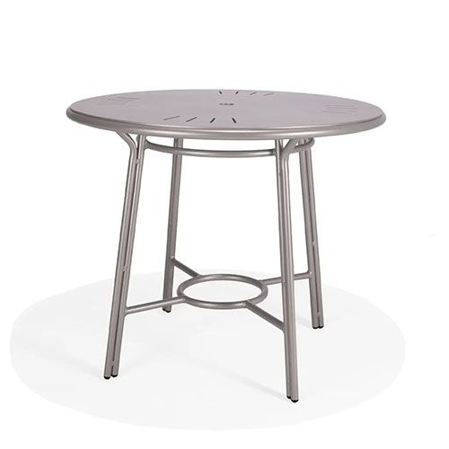 The Surf Round Balcony Height Table brings retro style to open air dining. Perfect for sitting or standing, the durable tubular aluminum table features a round aluminum table top with subtle notched detailing. The 42” surface provides plenty of room for snacks, drinks or a light meal. It’s perfect for extra dining space in large settings. Customize with our selection of exclusive powder coat finishes.