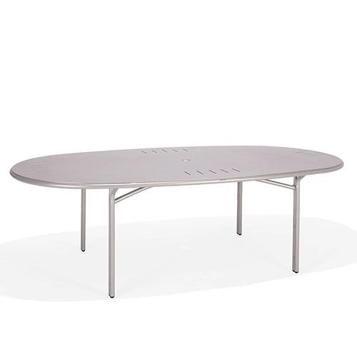 The Surf Oval Dining Table brings retro style to open air dining. The durable tubular aluminum table pairs features an oval aluminum table top with subtle notched detailing. Customize with our selection of exclusive powder coat finishes. Pair with our Surf Dining Chairs for the ideal patio or cafe dining set.